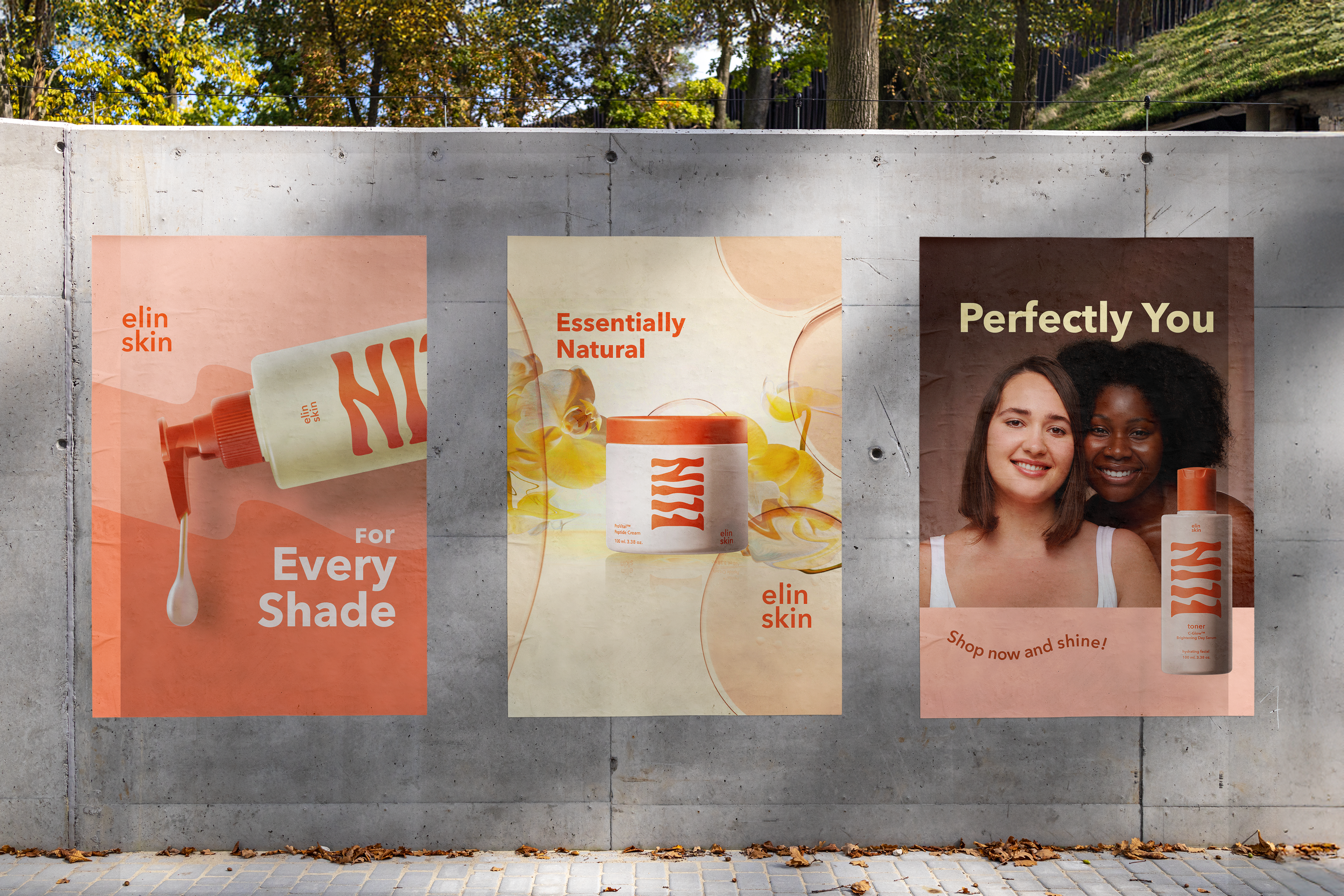 Elin is a skincare brand dedicated to offering premium products, including moisturizers, sunscreen, and serums, to promote healthy, glowing skin. The brand represents a blend of friendliness and elegance, with a vibrant orange color palette symbolizing strength and vitality. Its logo, featuring curved and wavy elements, exudes purity and sophistication. The promotional campaign emphasizes themes of water, nature, people, and skin, portraying the connection between natural beauty and self-care. The project includes the creation of posters, banner ads, and a captivating video promo, forming a cohesive and impactful brand identity.